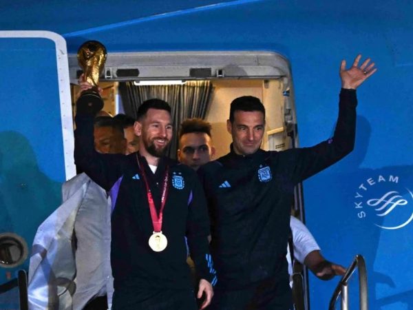 O primeiro jogador a descer do avião foi Messi, com a taça da Copa do Mundo nas mãos, ao lado do técnico Lionel Scaloni. Muitos jornalistas aguardavam na pista de pouso, que tinha um tapete vermelho da escada da aeronave até os ônibus destinados para a delegação.