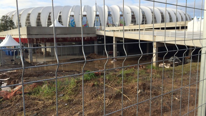 Os principais sinais de alagamento aparecem no estacionamento construído ao lado do próprio estádio, de frente para a Avenida Edvaldo Pereira Paiva. Os incidentes viraram, inclusive, piadas nas redes sociais. Na esquina da rua A, que fica entre o estádio e o Parque Marinha do Brasil, alguns entulhos e restos de obras eram encontrados também na esquina com a Edvaldo Pereira Paiva.