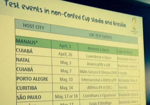Com a presença do secretário-geral, Jérôme Valcke, a Fifa divulgou nesta sexta-feira, no Rio de Janeiro, o calendário atualizado de eventos-testes oficiais para os estádios da Copa do Mundo. A principal novidade é a partida entre Goiás e Botafogo, que será realizada no Estádio Nacional Mané Garrincha, em Brasília, no dia 17 de maio.