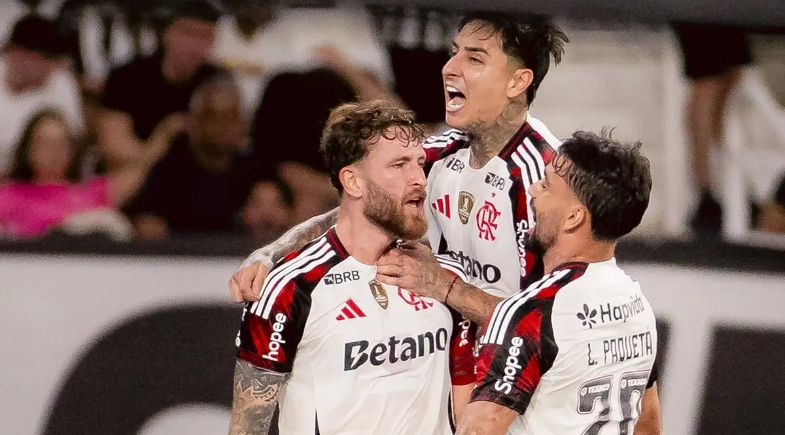 Léo Pereira, Pulgar e Paquetá em jogo contra o Botafogo pelo Brasileirão 2026 | Foto: Reprodução