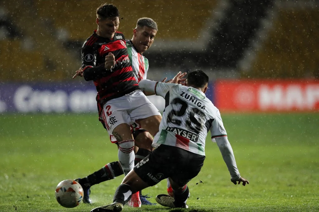 MARCAÇÃO - O jogo em Coquimbo teve um primeiro tempo disputado, com ambas as equipes se dedicando à marcação e poucas chances claras de gol. O Flamengo, embora tecnicamente superior, não conseguiu impor seu jogo, enquanto o Palestino pressionava na saída de bola rubro-negra.