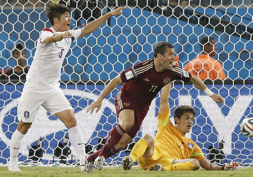 Quem dava emoção à partida era o goleiro russo Akinfeev, que em uma atuação insegura rebatia mal a maioria dos chutes da Coreia do Sul e assustava os europeus. De tanto repetir o lance, a falha finalmente veio: aos 23min, Ho Lee arriscou chute defensável de fora da área e o goleiro do CSKA foi tentar segurar com a mão espalmada, mas viu a bola bater em suas palmas, ir para trás e morrer no fundo do gol.