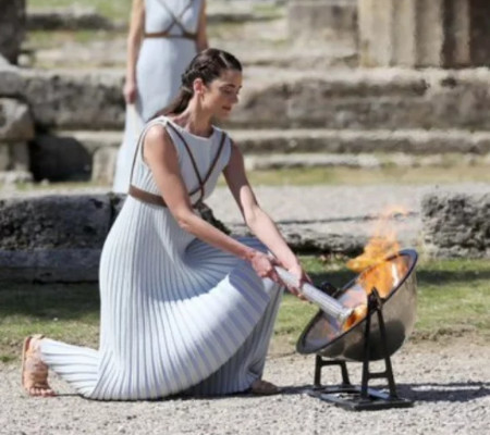 A tocha foi acesa com os raios do sol na última quinta-feira no local de nascimento dos Jogos na Olímpia Antiga, em uma cerimônia reduzida, sem a presença de público, em função da pandemia do coronavírus.