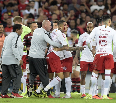 Depois, fez o mesmo e ainda deu um chute no ar, direcionado ao árbitro Luiz Flávio de Oliveira, que logo ergueu o cartão vermelho. Ele foi contido por companheiros e integrantes da comissão técnica. A confusão seguiu com um bate-boca entre Rafinha e os reservas do Inter antes de o jogo ser reiniciado.