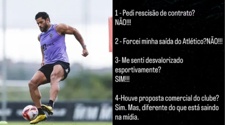 Hulk negou ter solicitado rescisão de contrato e se manifestou sobre uma possível saída do Atlético-MG em publicações em suas redes sociais na noite desta terça-feira (6). O atacante afirmou que, apesar de se sentir desvalorizado no aspecto esportivo, cumprirá seu contrato, válido até dezembro de 2026.