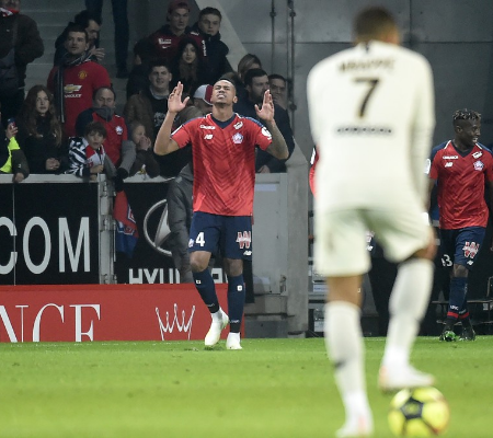 Brasileiro Gabriel comemora diante de Mbappe em PSG x Lille — Foto: AFP