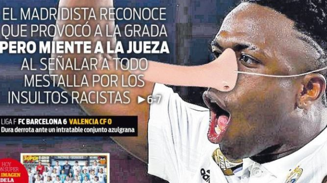A capa do jornal Superdeporte, de Valência desta quinta-feira (6), trouxe uma montagem que retrata Vini Jr. com o nariz de Pinóquio, acusando o número sete do Real Madrid de ser desonesto e também de incitar os torcedores. Nesse contexto, o atacante alega que a torcida do Valencia proferiu cânticos e gestos racistas contra ele, tendo ampla repercussão sobre o caso.