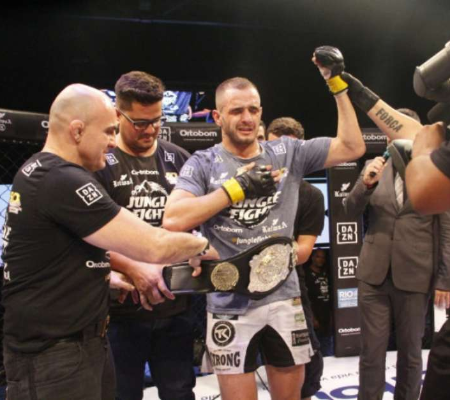 Um desfecho cinematográfico. Assim pode ser descrito a espetacular joelhada voadora aplicada por Lucas Almeida na luta principal do Jungle Fight no DAZN 99, que aconteceu no último sábado (30) no Rio de Janeiro. O nocaute conquistado no terceiro round contra o argentino Nicolas Cocuccio rendeu ao sorocabano o cinturão dos leves do maior evento de MMA da América Latina. Mesmo sem lutar há um ano, o atleta de 28 anos não sentiu o tempo parado e chegou a sua décima primeira vitória na carreira, e nenhuma delas precisou parar nas mãos dos juízes laterais. Com informações do Lance.