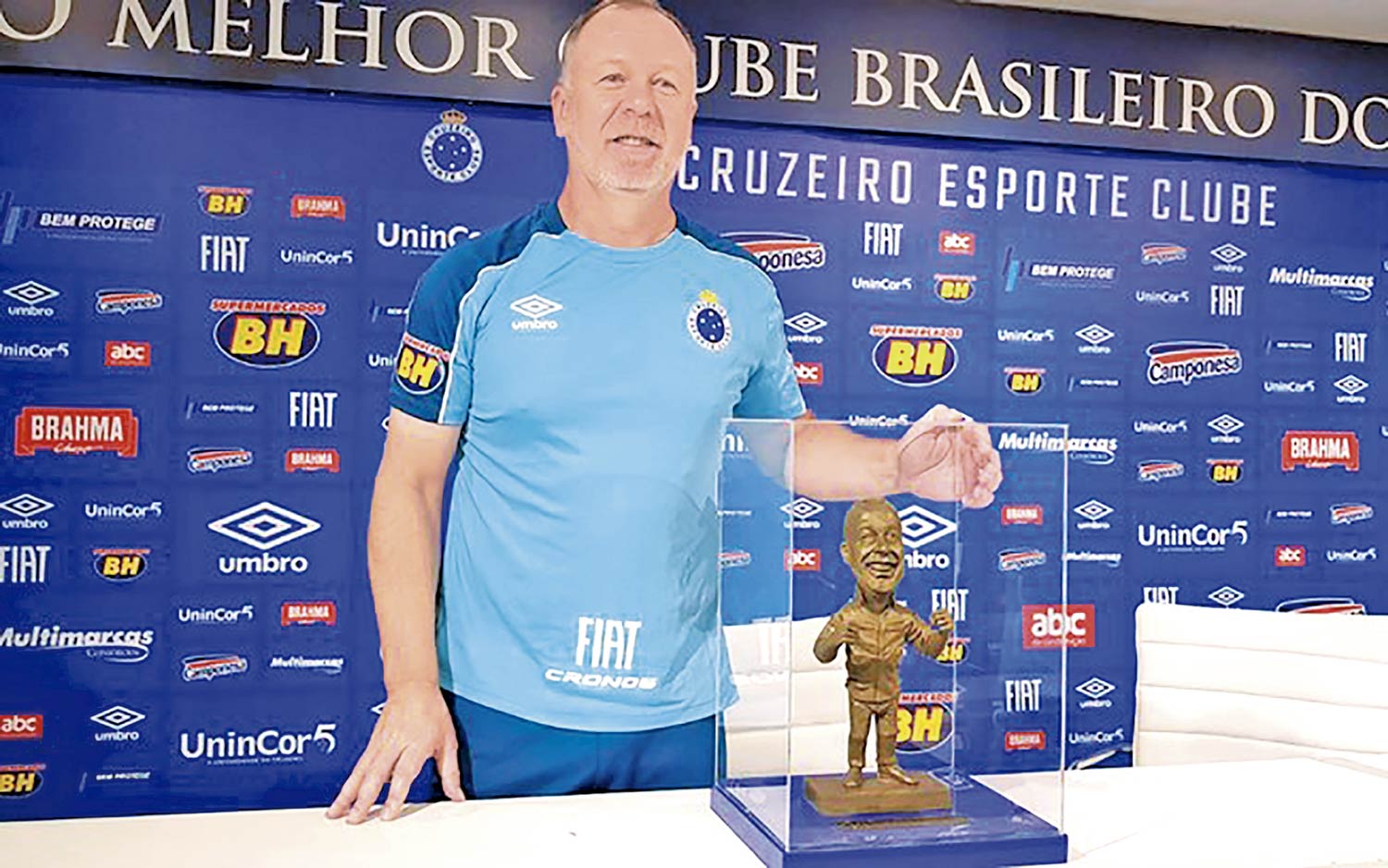 No dia 17 de fevereiro o técnico Mano Menezes completou 200 jogos a frente do Cruzeiro e durante coletiva de imprensa nesta terça-feira (26), o treinador foi homenageado pelo clube com uma escultura. O presente foi confeccionado pelo artista Felipe Soares e entregue pelo presidente do Cruzeiro, Wagner Pires de Sá. Mano Menezes está no clube mineiro desde 2016 e conquistou o Bicampeonato da Copa do Brasil, em 2017 e 2018, e o campeonato mineiro do ano passado. Na homenagem, Wagner comentou sobre o respeito e admiração que tem pelo treinador. “Para mim é um prazer imenso e um grande orgulho homenagear essa pessoa maravilhosa, que desde o princípio da nossa administração nos prestigiou, teve confiança na gente”.