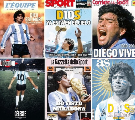 A morte de Diego Armando Maradona, aos 60 anos, foi destaque no noticiário esportivo internacional e dominou as manchetes dos principais veículos de imprensa mundial, não só de esporte, que destacaram diferentes aspectos sobre "El Pibe". Um dos primeiros a liberar nas redes sociais a capa da sua edição impressa desta quinta foi o francês "L'Eequipe", com o título "Deus está morto".