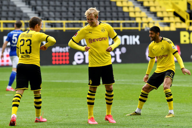 E, em meio a tantas novidades com a retomada do esporte, também teve bom futebol dentro das quatro linhas. O Borussia Dortmund teve grande atuação e passeou no campo diante do grande rival local, mesmo desfalcado de nomes como Reus e Emre Can. O setor ofensivo da equipe funcionou muito bem, com boas atuações de Brandt, Hazard, Hakimi Guerreiro e... Haaland, autor do primeiro gol da volta da Bundesliga. O atacante sensação da temporada 2019/20 ainda deu uma assistência e aproveitou a má atuação do Schalke, principalmente da defesa, a começar pelo goleiro Schubert.