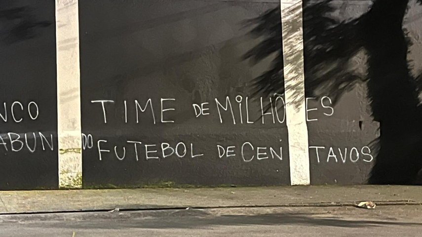 PICHADO - As palavras "Elenco vagabundo" e "Time de milhões, futebol de centavos" foram escritas em um dos muros do clube paulista. Essa derrota na Argentina marcou a terceira consecutiva do Corinthians, com duas pelo Campeonato Brasileiro e uma na Copa Sul-Americana. Além disso, o time não conseguiu marcar nenhum gol nos últimos quatro jogos.