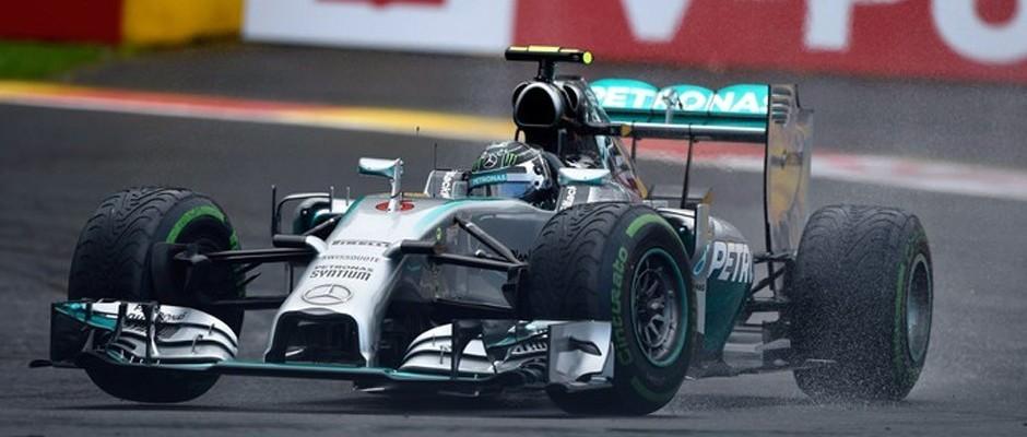 No fim de semana do GP da Bélgica, os pilotos da Fórmula 1 aderiram à febre do “desafio do balde de gelo”. Desafiados por Felipe Massa, Daniel Ricciardo e Fernando Alonso levaram banho de água fria em pleno paddock de Spa-Francorchamps, na campanha que busca arrecadar fundos para a doença chamada esclerose lateral amiotrófica, e botaram também Lewis Hamilton na roda. Neste sábado, parece que São Pedro resolver entrar na brincadeira também e derrubou uma forte e gelada chuva na região durante o treino que definiu o grid de largada para corrida deste domingo. E na fria e encharcada pista belga, ninguém conseguiu desafiar o líder do campeonato Nico Rosberg. O alemão da Mercedes, mais uma vez, mostrou concentração e perícia para anotar 2m05s591 e assegurar a pole position, sua sétima em 12 etapas em 2014. Seu companheiro de time, Hamilton, até ensaiou ameaçá-lo, batendo a marca no primeiro setor do circuito. Mas o britânico não manteve o ritmo até o fim e terminou em segundo, com 2m05s819.