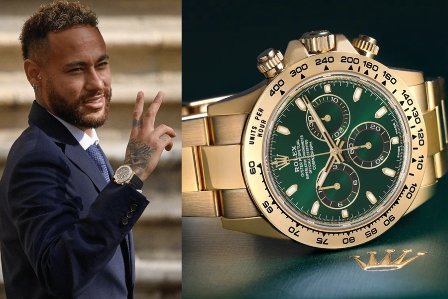 Durante o chá-revelação de sua filha com a atriz Bruna Biancardi, Neymar exibiu um Audemars Piguet Royal Oak. O modelo em ouro amarelo de 18 quilates tem um fundo imitando uma tapeçaria e a icônica luneta octogonal com oito parafusos hexagonais.