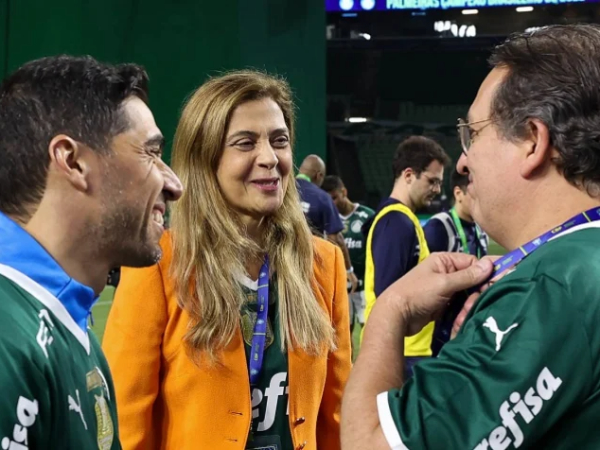 Abel Ferreira, Leila Pereira e Paulo Buosi conversam após o título brasileiro (Foto: Cesar Greco/Palmeiras)