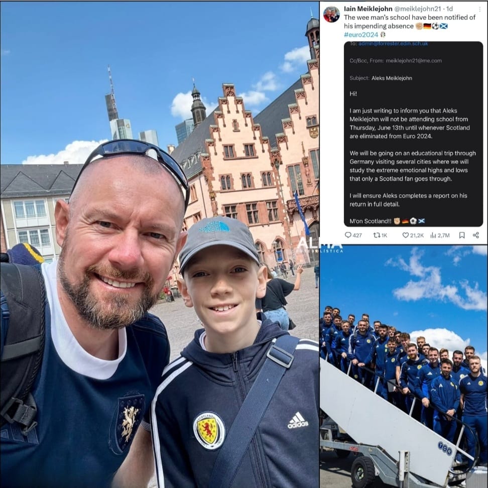 Dentre todos os torcedores, uma história tomou conta das redes sociais na Europa: A história de Iain Meiklejohn e seu filho Aleks. Iain viralizou após postar um e-mail que enviou para a escola de Aleks, informando que o filho iria faltar às aulas até quando a Escócia ainda estivesse na competição continental.