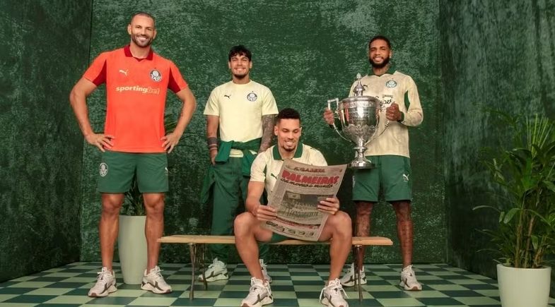 O Palmeiras apresentou nesta terça-feira (10) seu novo uniforme para a disputa da Copa do Mundo de Clubes. A camisa dourada, criada em parceria entre Puma e KidSuper, será usada na partida contra o Inter Miami, de Lionel Messi, marcada para o dia 23 de junho, no Hard Rock Stadium, nos Estados Unidos.