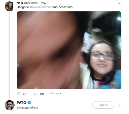 “Obrigada @Alexandre Pato amei nossa foto”, escreveu a torcedora . “Desculpa, tentei atender a todos que estavam lá, mas vejo que a foto não foi boa! Te convido a vir aqui no hotel às 13:00 e todos irão tirar foto com você”, respondeu o atacante do Tricolor.