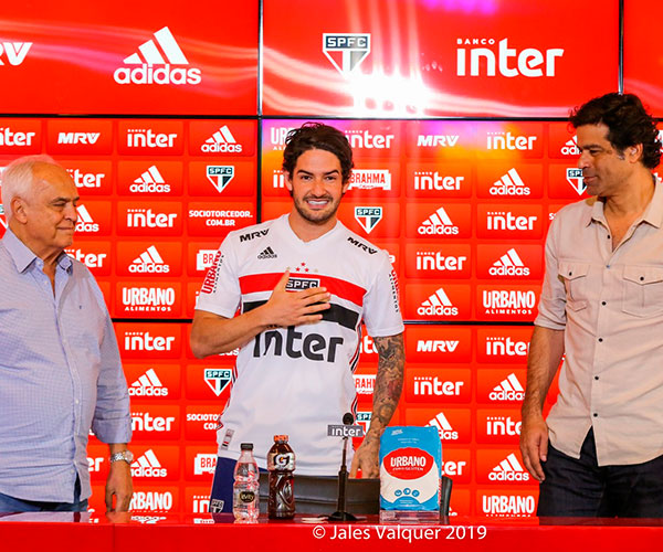 Alexandre Pato foi apresentado pela diretoria do São Paulo como reforço nesta sexta-feira, no CT da Barra Funda. Ao lado do presidente Carlos Augusto de Barros e Silva, o Leco, e do diretor executivo Raí, o atacante se declarou ao clube antes mesmo de vestir a camisa dada pelos dirigentes.