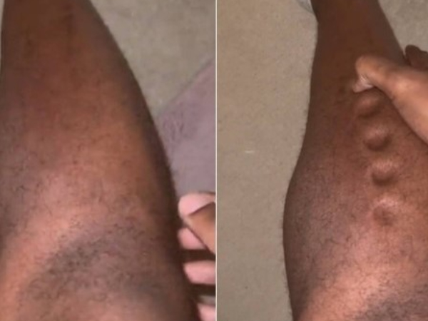 A perna esquerda ele coloca o polegar e fica marcada seis vezes. As marcas é como se fossem amassados surgiram nos pontos em que ele havia apertado.