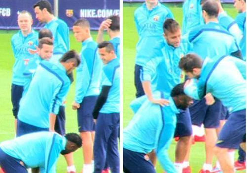 Jordi Alba e Song "conspiraram" para derrubar Neymar. O camaronês deitou no chão, enquanto o lateral espanhol tentou empurrar o brasileiro - não conseguiram. Neymar, então, entrou na brincadeira e foi seguro por Alba enquanto tentava tirar satisfações de Song.