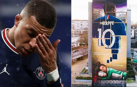 O mural foi feito pela Nike, marca que o vestiu quando completou 21 anos. Nele há um desenho de Mbappé criança dormindo com uma bola, um de Kylian com a camisa do time francês e uma frase que o define: "Ame seus sonhos e eles vão te amar de volta".
