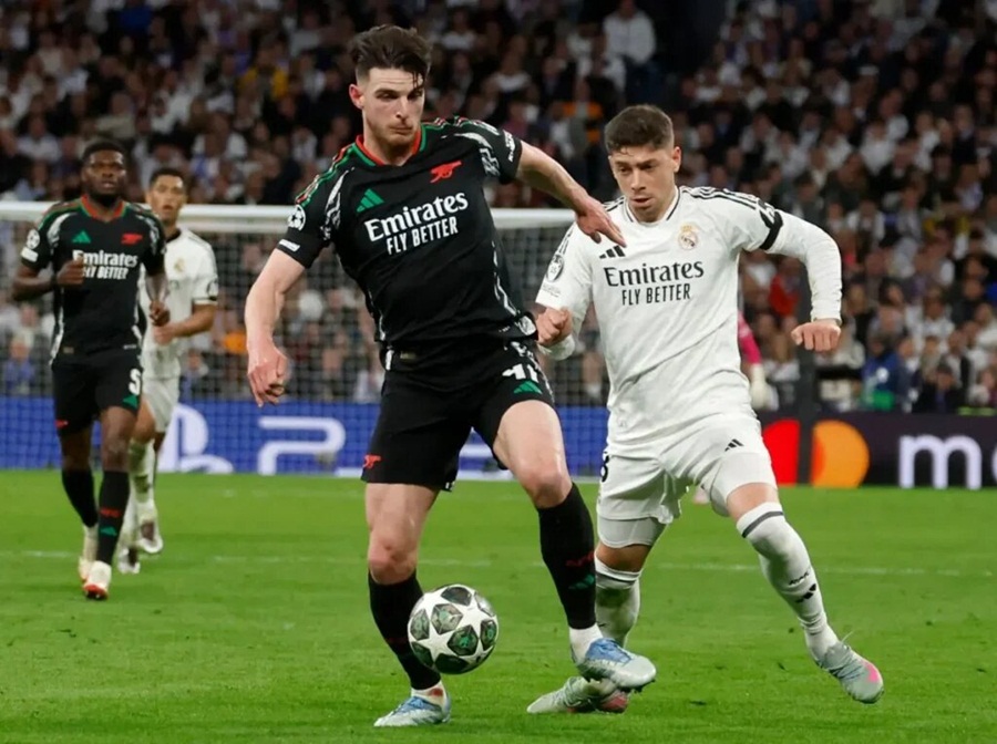 Pouco depois, aos 23 minutos, o Real Madrid teve sua chance. Mbappé foi agarrado por Rice dentro da área e a arbitragem assinalou pênalti. No entanto, após nova revisão no VAR, a marcação foi anulada.