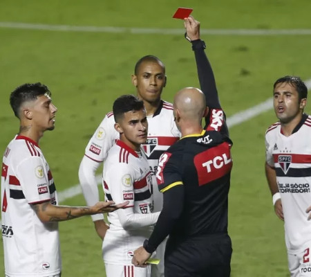 Pouco depois, aos 37 minutos, o volante são-paulino não se livrou da uma severa punição do juiz. Disputando a bola, ele acabou acertando não intencionalmente o rosto do adversário, e, após revisão do VAR, Dyorgines de Andrade acabou tirando o cartão vermelho do bolso.