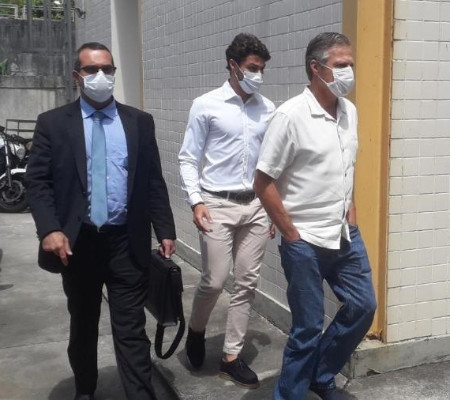 Após prestar depoimento, Marcinho e o pai Sergio Lemos de Oliveira saem da delegacia ao lado do carro do acidente — Foto: Davi Barros / ge