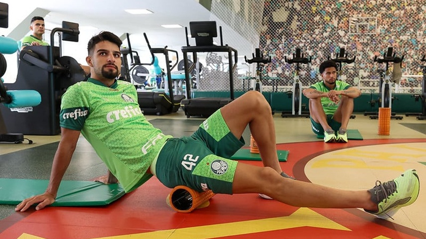 Jogadores do Verdão durante atividade na academia antes da estreia da Libertadores | Foto: Fabio Menotti/Palmeiras