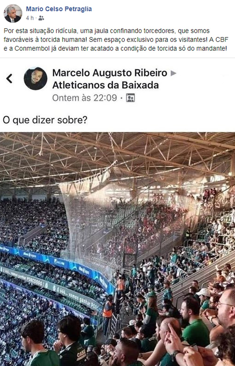 "Por esta situação ridícula, uma jaula confinando torcedores, que somos favoráveis à torcida humana! Sem espaço exclusivo para os visitantes! A CBF e a Conmebol já deviam ter acatado a condição de torcida só do mandante!", escreveu.