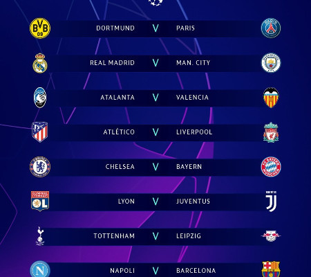 O Barcelona enfrentará o Napoli, enquanto Chelsea e Bayern de Munique reeditarão a final da edição 2011/12, e a Juventus terá como rival o Lyon - que tem como diretor de futebol o ex-jogador Juninho Pernambucano. Vice-campeão em 2018/19, o Tottenham enfrentará o RB Leizpig. Atalanta e Valencia protagonizarão o confronto com menos tradição.