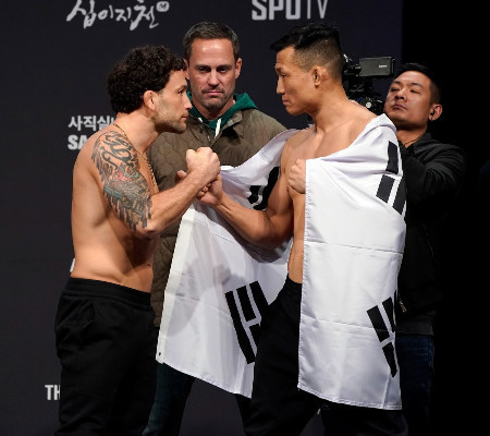 A pesagem do UFC Busan, realizada na manhã desta sexta-feira na Coreia do Sul, aconteceu sem sustos ou problemas. Todos os 26 atletas escalados para o último evento da organização em 2019 bateram o peso e confirmaram presença no torneio. Protagonista da luta principal, o peso-pena americano Frankie Edgar surpreendeu ao ostentar uma "cabeleira", inovando no seu estilo, na encarada com o coreano Chan Sung Jung, o Zumbi Coreano. Após a encarada, Edgar arrancou aplausos dos fãs presentes ao evento ao dar um grito de guerra coreano no microfone. Asinformaçõessão do Combate.
