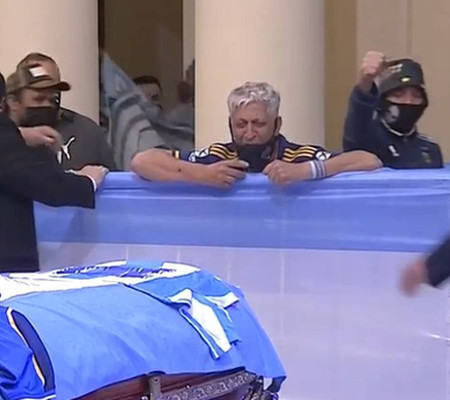 Do lado de dentro, o caixão com o corpo de Maradona estava ao ar livre no salão interno, fechado e coberto com uma camiseta da Argentina de número 10. As pessoas passavam diante dele e gritavam: "Obrigada, Diego", "Você é Deus”, além de jogarem camisetas, terços e outros objetos.