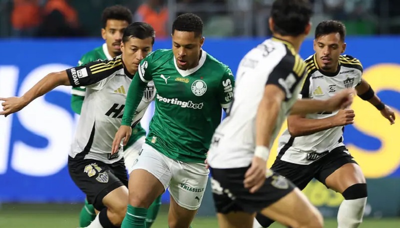 Lucas Evangelista, Júnior Alonso (contra) e Mauricio fizeram os gols palmeirenses, enquanto Hulk, duas vezes de falta, marcou para o Galo.