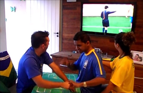 Hélio Fonseca de Araújo e Regiane Cunha Pereira ajudaram o amigo Carlos, que é cego e surdo, a acompanhar partida do Brasil pela Copa do Mundo
