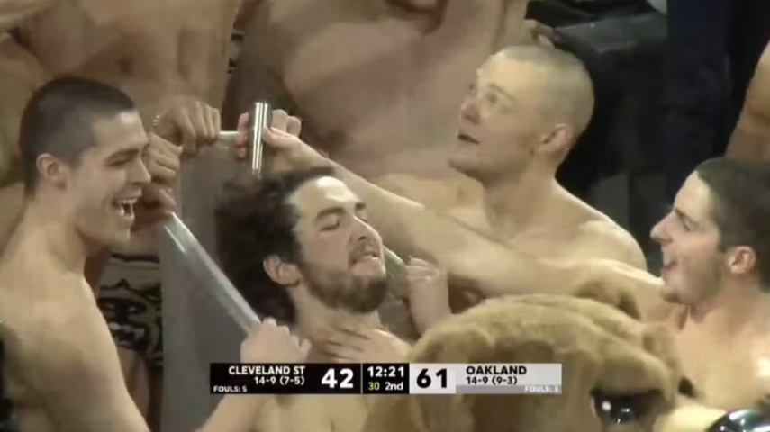 Quando se trata de encontrar maneiras de provocar adversários, os torcedores muitas vezes surpreendem. No basquete universitário dos Estados Unidos (NCAA), os fãs do Oakland Golden Grizzlies adotaram uma estratégia bastante peculiar no sábado (3): raspar o cabelo de um rapaz para distrair os jogadores do Cleveland State Vikings durante cobranças de lances livres. Em pelo menos uma ocasião, a tática mostrou-se eficaz, resultando em uma vitória por 83 a 71 para o Oakland (Confira o vídeo abaixo).