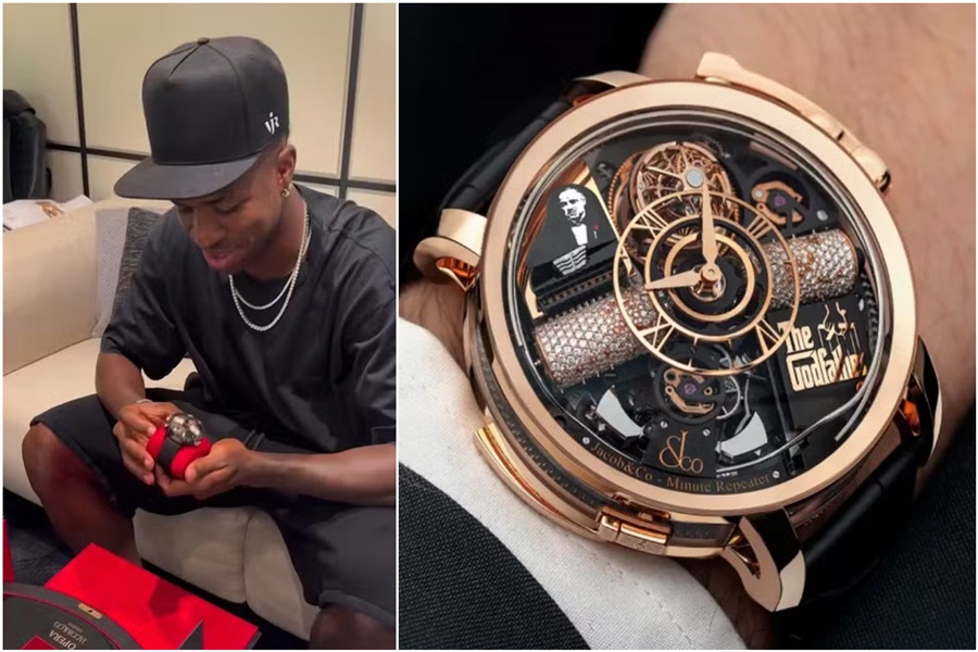 Sem a Bola de Ouro, mas com um acessório milionário: Vinicius Jr. adquiriu um relógio Jacob & Co Opera Godfather Diamond Barrels, avaliado em R$ 2,3 milhões. Em colaboração com a Paramount, o relógio é inspirado no filme O Poderoso Chefão e é capaz de tocar o icônico tema musical com 120 notas, graças ao seu sofisticado mecanismo de turbilhão de eixo triplo.