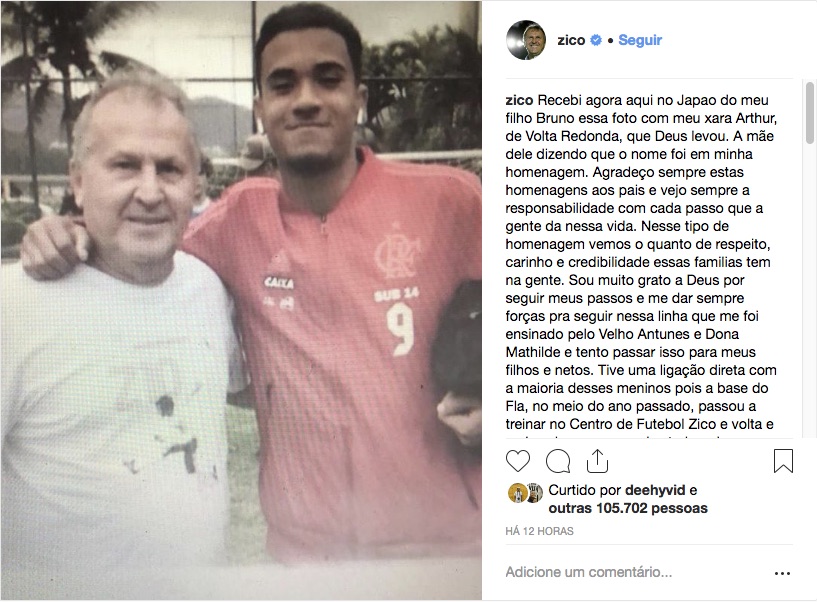 “Recebi agora aqui no Japão do meu filho Bruno essa foto com meu xará Arthur, de Volta Redonda, que Deus levou. A mãe dele dizendo que o nome foi em minha homenagem. Agradeço sempre estas homenagens aos pais e vejo sempre a responsabilidade com cada passo que a gente da nessa vida. Nesse tipo de homenagem vemos o quanto de respeito, carinho e credibilidade essas famílias tem na gente. Sou muito grato a Deus por seguir meus passos e me dar sempre forças para seguir nessa linha que me foi ensinado pelo Velho Antunes e Dona Mathilde e tento passar isso para meus filhos e netos. Tive uma ligação direta com a maioria desses meninos pois a base do Fla, no meio do ano passado, passou a treinar no Centro de Futebol Zico e volta e meia esbarrava com eles treinando. Alguns participaram da Copa Amizade Brasil Japão, que realizo todos os anos no CFZ em agosto. Também participaram de gravação no meu canal Zico 10, no Youtube, jogando Futmesa, além de estarem no clube do meu coração. Que Deus conforte essas famílias e receba os meninos com todo amor que eles merecem”, disse.