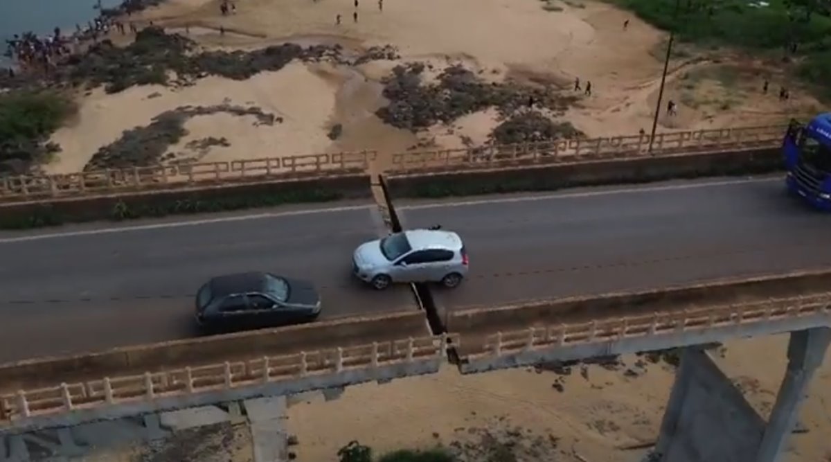 Imagens aéreas mostram um carro preso em uma fenda aberta após o desabamento de uma ponte entre Tocantins e Maranhão na tarde deste domingo (22). A estrutura, que leva o nome de Juscelino Kubitschek de Oliveira e está localizada na BR-226, entre as cidades de Estreito e Aguiarnópolis, teve o vão central comprometido, deixando partes do asfalto rachadas.