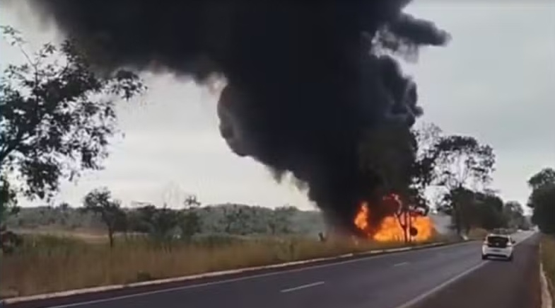 O veículo, que seguia para abastecer um posto de combustível, foi consumido pelo fogo.