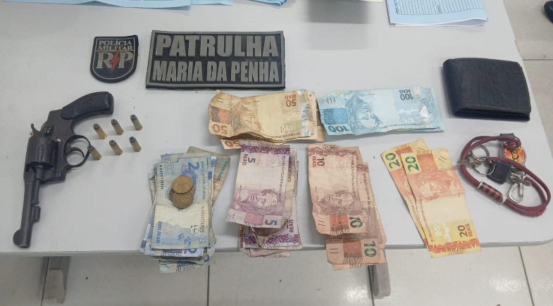 Após buscas, os policiais localizaram o suspeito, que tentou fugir ao avistar a viatura. Durante a abordagem, os militares encontraram um revólver calibre .32 com seis munições intactas e a quantia de R$ 608,00 em cédulas diversas. O homem apresentava sinais de embriaguez alcoólica.