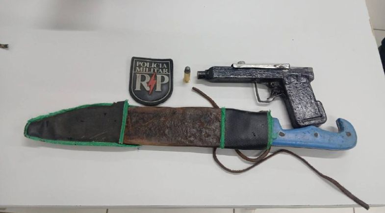 No local, os policiais confirmaram a denúncia. Segundo relato da vítima, além das ameaças, ela também foi impedida de sair de casa. Durante buscas na residência, a guarnição encontrou uma arma de fabricação caseira, calibre .38, municiada, além de um facão.