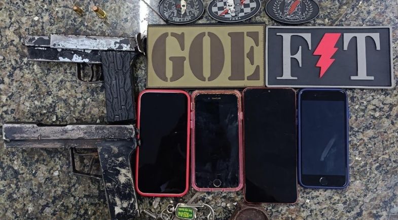 Foram localizadas e apreendidas duas armas de fogo artesanais, sendo uma portada por um dos indivíduos e a outra encontrada no momento em que outro suspeito tentava esconder o objeto em um armário da residência.