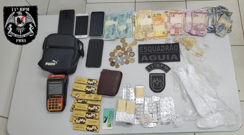 Durante a revista pessoal e a busca no imóvel, os agentes encontraram uma série de itens que reforçam a suspeita de tráfico de drogas: