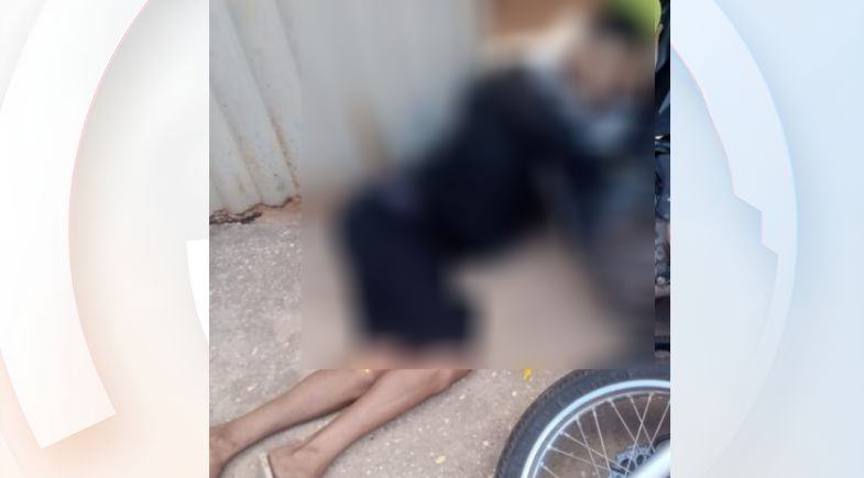 Imagens obtidas pela reportagem mostram o corpo de um dos suspeitos morto, caído sob uma motocicleta na calçada de uma residência.