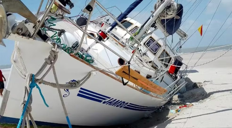 Os ventos levaram a embarcação até um banco de areia, onde ficou encalhado. No veleiro estavam um brasileiro e um sul-africano, que abandonaram o barco e buscaram ajuda.