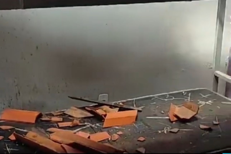 Imagens feitas no local mostram os danos materiais, com telhas e ripas quebradas. Parte das telhas caiu sobre as camas dos policiais, espalhando pedaços de madeira e entulho pelo ambiente.