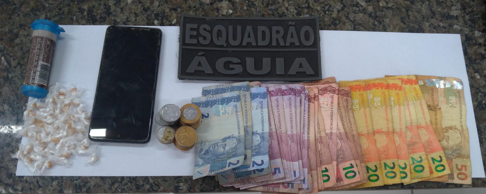 Ao abordá-lo e realizar a revista pessoal, os policiais encontraram com o menor uma quantidade considerável de uma substância aparentando ser cocaína, além de uma quantia de dinheiro trocado, possivelmente oriunda da venda de entorpecentes.