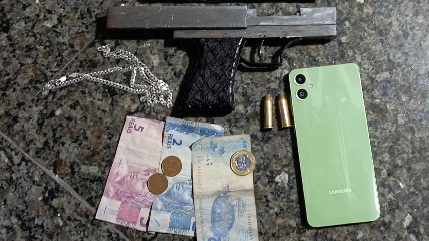 O QUE FOI APREENDIDO – Com os três presos a polícia encontrou 01 arma de fogo de fabricação caseira semi-industrial cal. 38; 02 munições cal. 38 intactas; R$10,10 (dez reais e dez centavos); 01 cordão de cor prata e 01 celular Samsung.